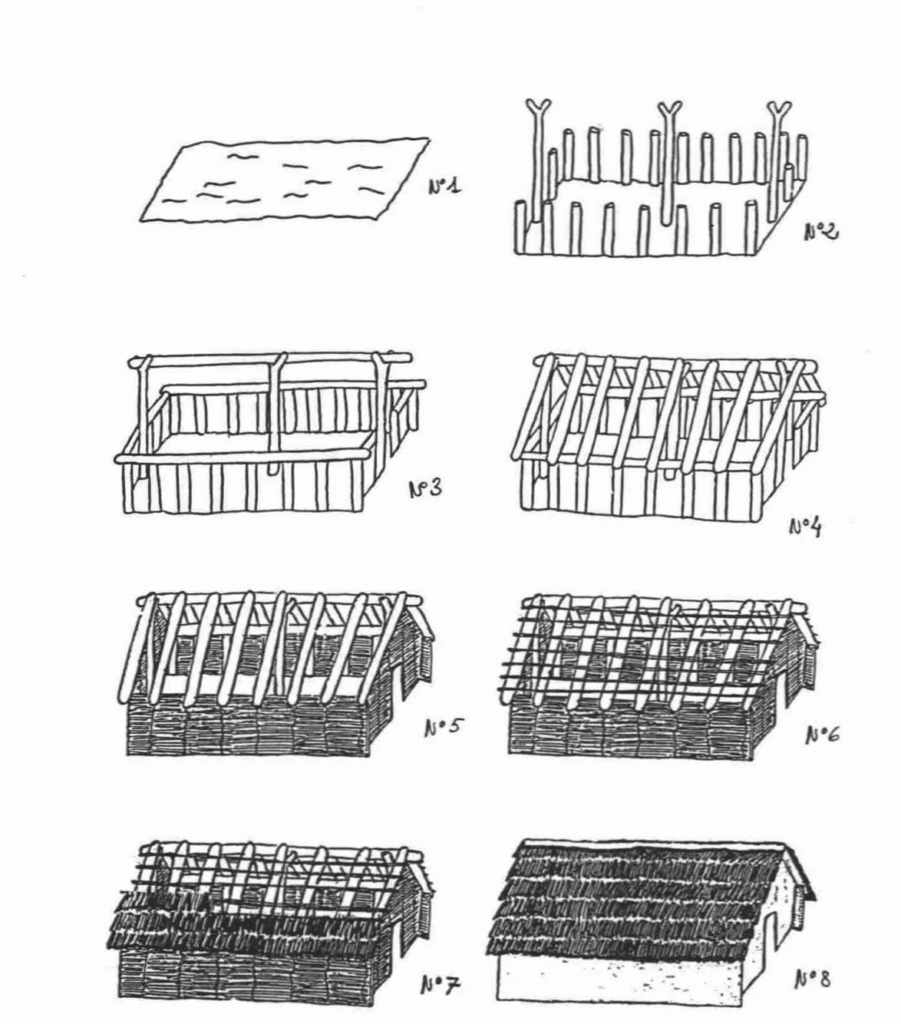 Primero se preparaba el terreno, y se clavaban directamente en la tierra los troncos que hacían de estructura, tanto la perimétral como la central. No había planos ni modelos únicos: cada barraca se adaptaba al uso que se le iba a dar. La estructura se completaba con costillas inclinadas que daban forma al tejado a dos aguas, pensado para evacuar bien el agua, sino que también resguardaba las paredes del agua y el sol. Sobre ese esqueleto se cosían cañas, una a una, con la única herramienta imprescindible de esta construcción: la aguja barraquera, larga, curva y diseñada para coser los manojos de brossa que conforman la cubierta. Luego venía lo más delicado: tejer esa cubierta vegetal capa a capa, bien apretada, para asegurar impermeabilidad y durabilidad. Por último, las paredes se recubrían con barro trabajado con los pies y se encalaban con cal y blavet. Todo se hacía con las manos y con lo que había cerca, sin máquinas, sin diseño, pero con una lógica y una sabiduría rotundas.